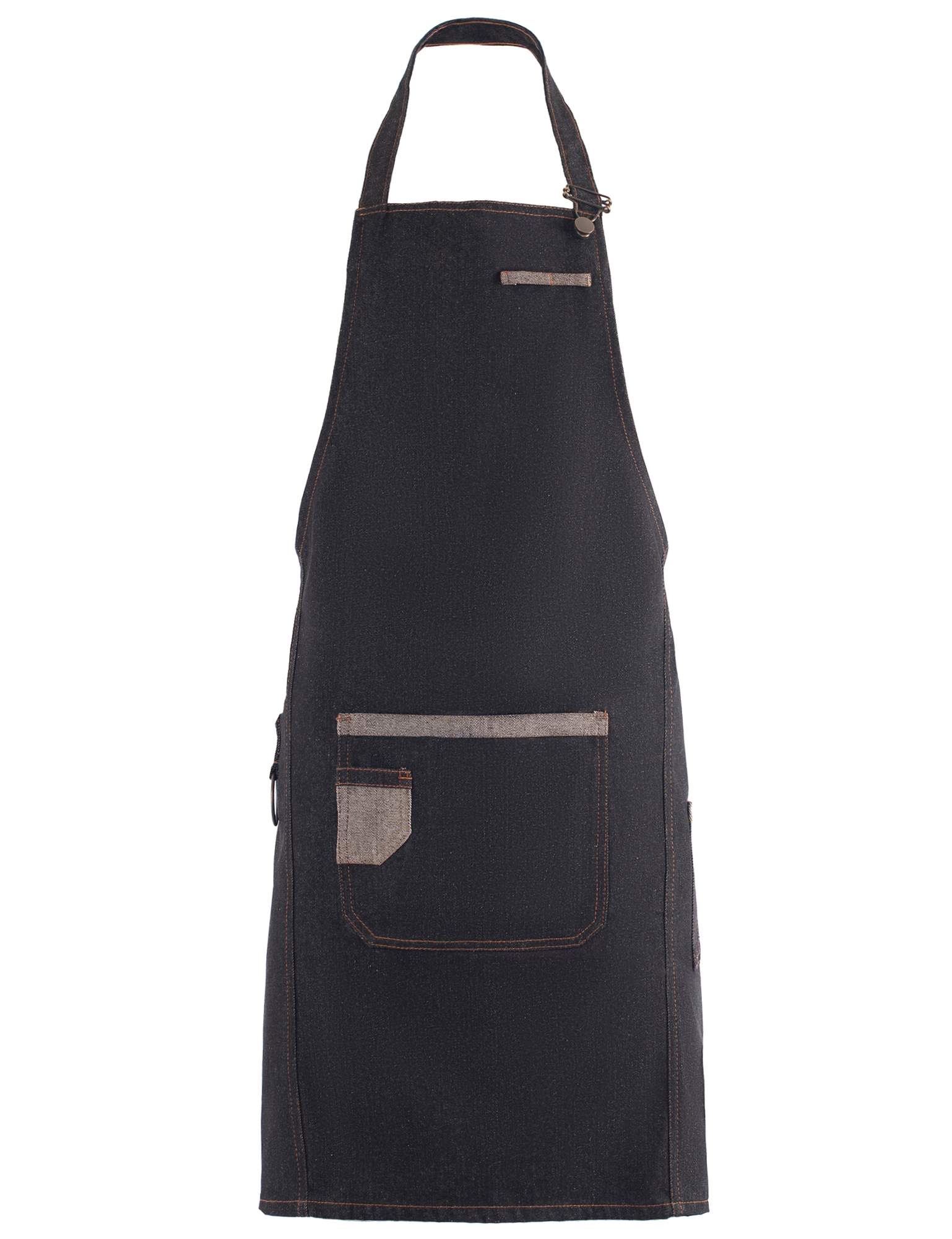 Ποδιά λαιμού από μαύρο τζιν, με μεταλλικό μπρονζέ ρυθμιστή για εύκολη χρήση. Μία μεγάλη τσέπη στο κέντρο με επισυναπτόμενη διακοσμητική τσέπη. Μία τσέπη κάτω αριστερά. Μπρονζέ κρίκος για πετσέτα. Διακοσμητικά θηλύκια στο στήθος. Ελληνικό προϊόν. 11oz | 100% cotton