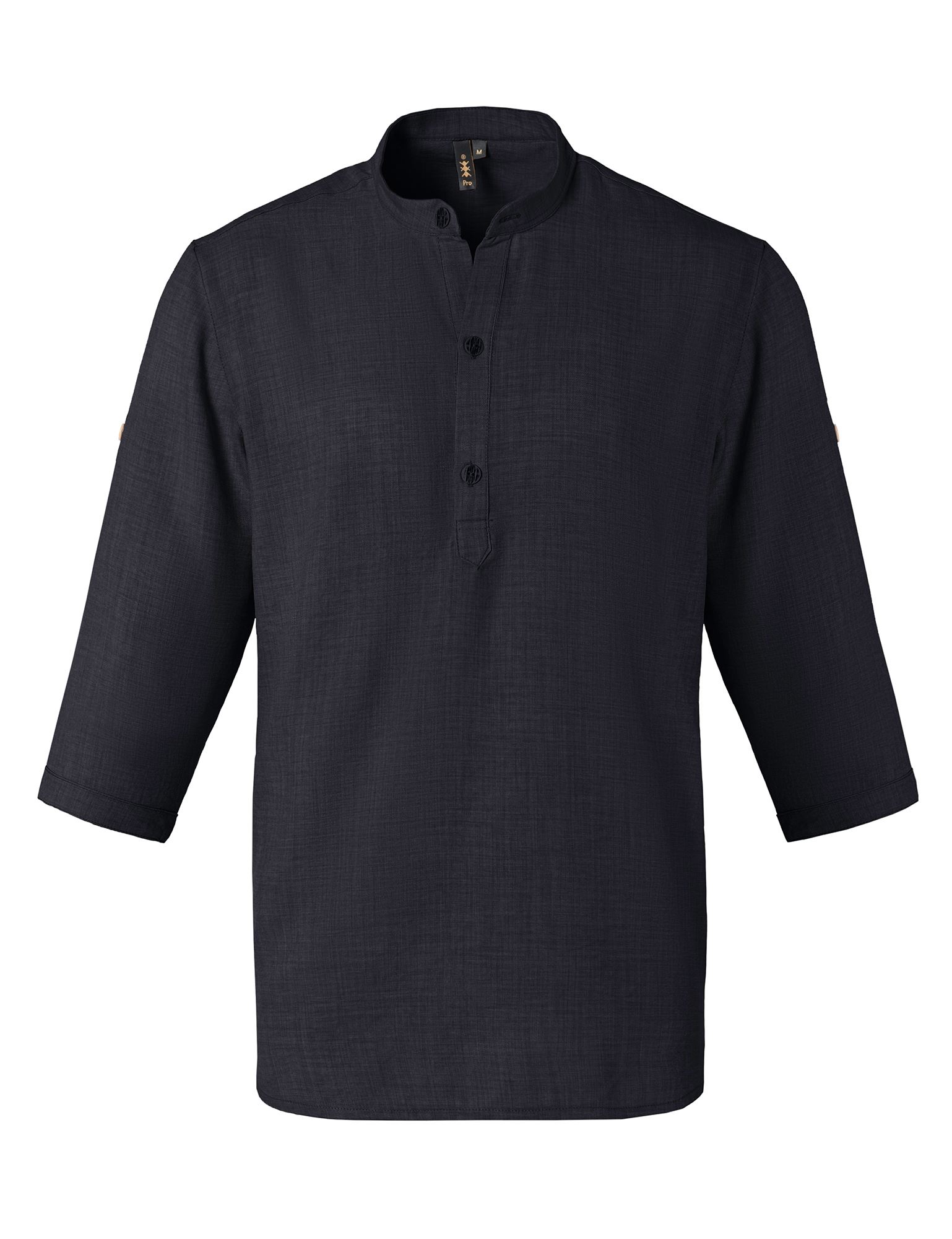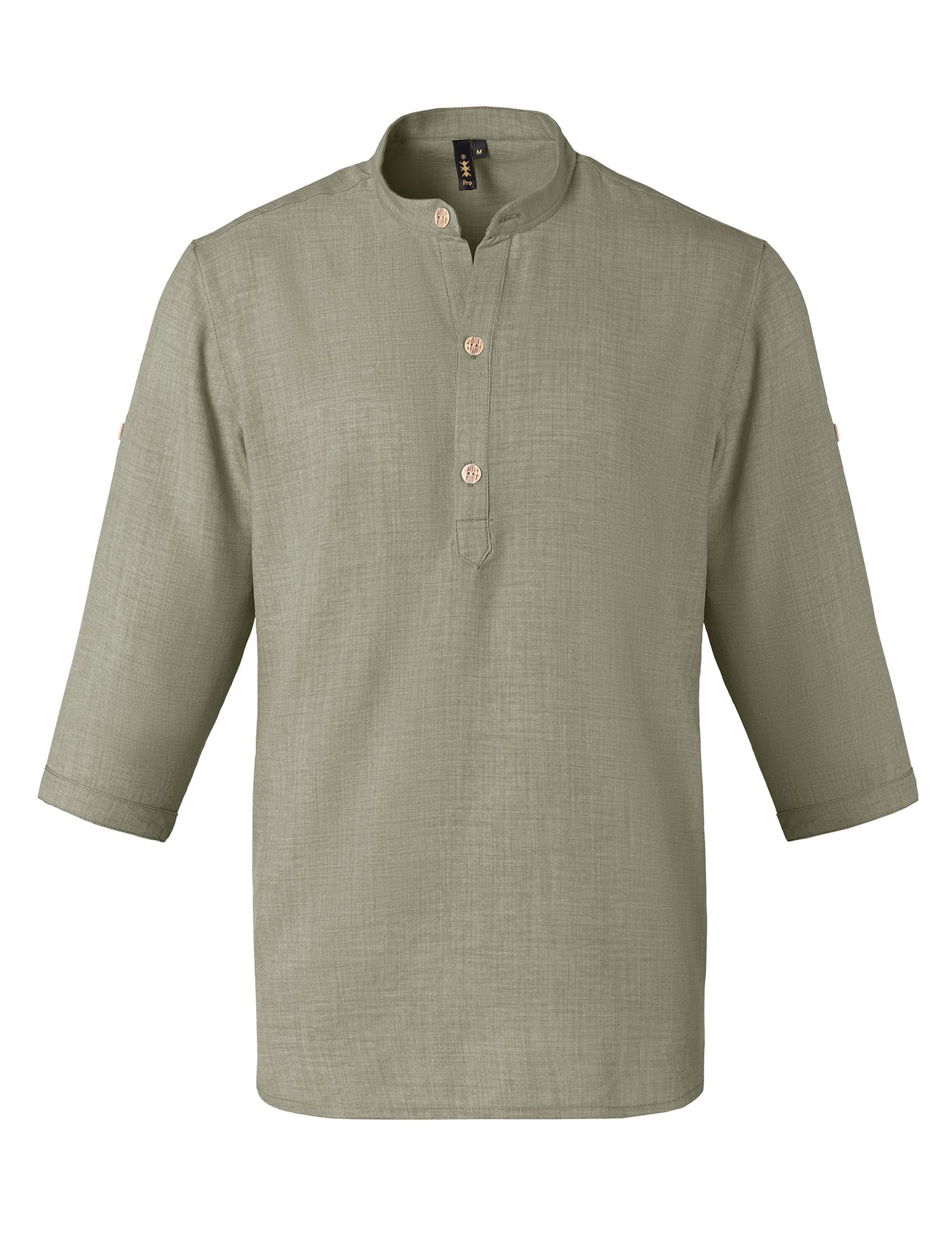 UNISEX πουκαμίσα με 3/4 μανίκι, γιακά τύπου ΜΑΟ, πατιλέτα, 3 κουμπιά μπροστά, ωμίτη, αναδιπλούμενα μανίκια, κουφωτή πιέτα στην πλάτη, σκίσιμο στα πλαϊνά. Ελληνικό προϊόν. 140gsm | 100% polyester “air washed linen look”