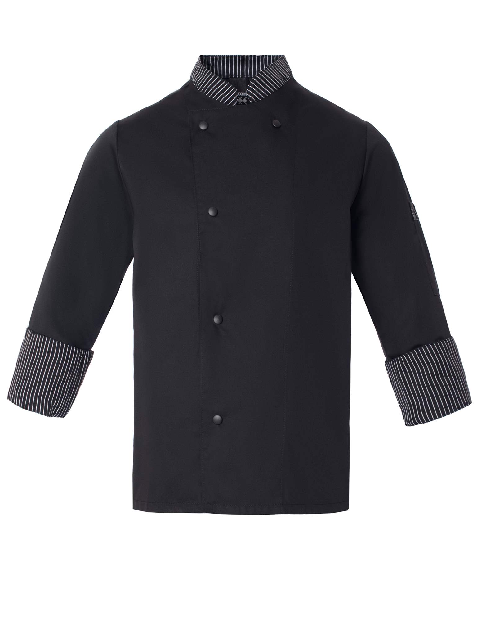 UNISEX μαγειρικό σακάκι με ριγέ λεπτομέρειες στο λαιμό και στη μανσέτα. Κλείνει μπροστά με τρούκ. Μία τσέπη στο αριστερό μανίκι. Γιακάς τύπου ΜΑΟ. Αναδιπλούμενα μανίκια. Ελληνικό προϊόν. 165gsm | 65% pol - 35% cot